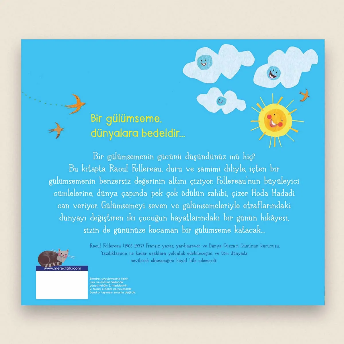 Raoul Follereau (1903-1977) Fransız yazar, yardımsever ve Dünya Cüzzam Günü’nün kurucusudur. Follereau; gülümsemeyle yapılan nazik, anlayışlı davranışların iyileştirici gücünü anlattığı dizelerinin, ne kadar uzaklara yolculuk edebileceğini ve tüm dünyada sevilerek okunacağını asla hayal bile edemezdi. Sanatçı Hoda Hadidi’nin, karakterlerin duygularını yansıtarak oluşturduğu ayrıntılı, rengarenk ve olağanüstü zarif kolaj desenleri ise, kitabın her sayfasını neşe ve mutlulukla dolduruyor.